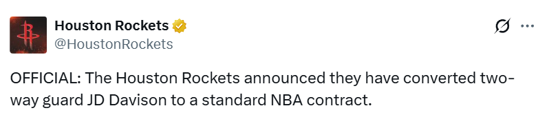 火箭官宣转正戴维森!敲定季后赛15人名单 杜兰特申京率队冲冠