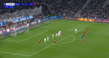 半场补时第2分钟,索博斯洛伊主罚前场任意球,选择直接贴地斩破门,利物浦1-0马赛。