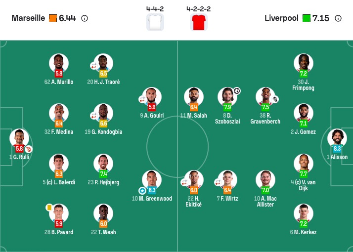 马赛首发:1-鲁利、28-帕瓦尔、5-巴列尔迪、32-梅迪纳、62-穆里略、19-孔多比亚(67'14-派尚)、23-霍伊别尔、9-古伊里(67'97-奥巴梅扬)、10-格林伍德、22-维阿、20-H·特拉奥雷(67'26-纳迪尔)