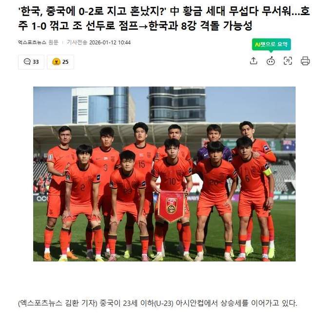 还有报道表示,太疯狂了!中国队竟然位列小组第一?一个巨大的奇迹发生了:中国队1比0战胜了澳大利亚队。很显然,大部分韩国媒体都对中国U23击败澳大利亚表达了巨大震惊,而且他们也提到了2个月前的熊猫杯,中国队曾2比0完胜韩国,而四分之一决赛很可能碰上韩国队。